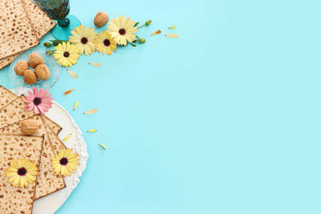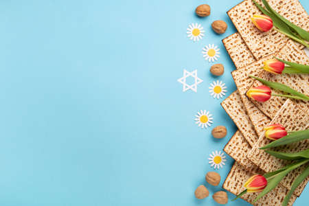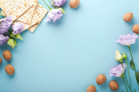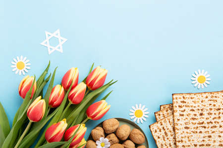 Jewish holiday Passover greeting card concept with matzah, nuts, tulip and daisy flowers on blue table. Seder Pesach spring holiday background, top view, copy space.