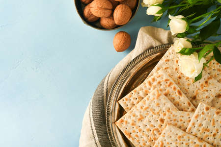 Passover celebration concept. Matzah, red kosher walnut and spring beautiful rose flowers. Traditional ritual Jewish bread on light turquoise or blue background. Passover food. Pesach Jewish holiday.