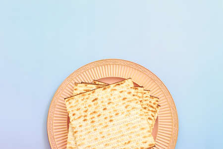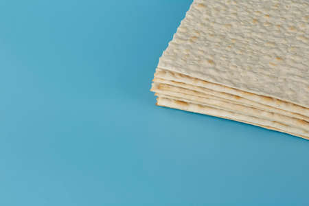 Traditional Jewish matzah on a blue background. Free space.