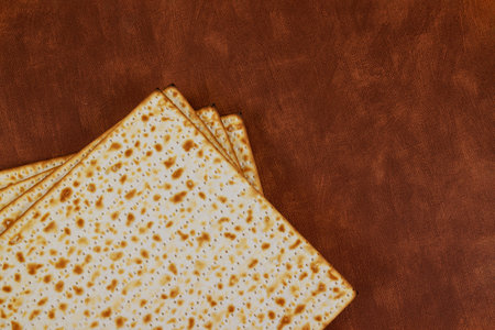 A pile of matzah isolated on a brown background. Matzah unleavened bread made only with flour and water. Jewish holiday of Pesach (Passover) concept.