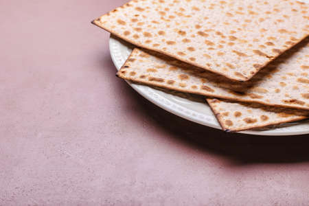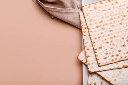 Jewish flatbread matza for Passover on color background