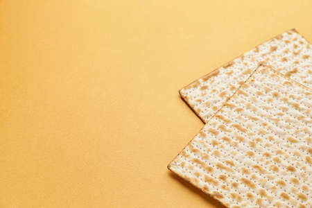 Matzo unleavened bread for Pesach, Jewish holiday of Passover. Matzah flatbreads isolated on yellow background.