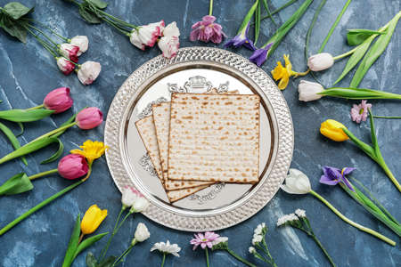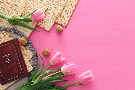jewish holiday of Passover and its attributes, with matzo and spring tulips - Happy Passover