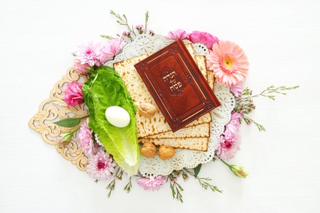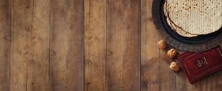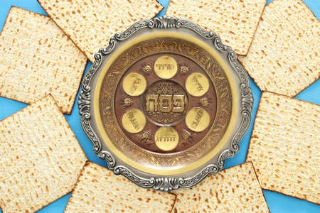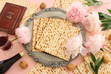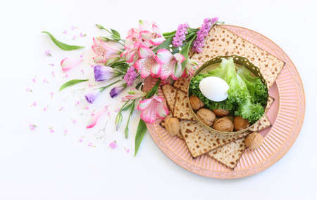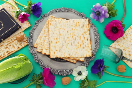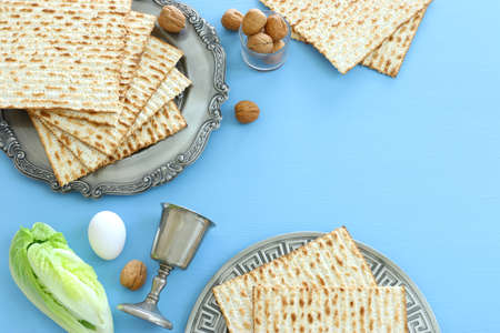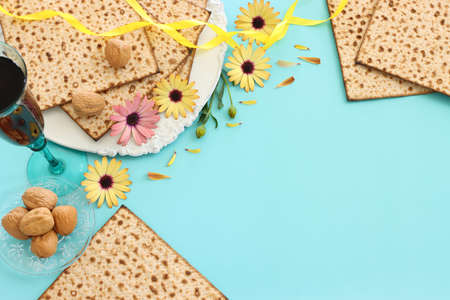 Passover celebrating of great Jewish family holiday symbols with traditional kosher matzah