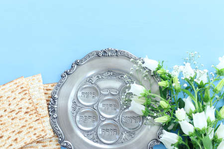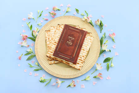 Pesah celebration concept - Matzo and seder background with white flowers and Traditional book with text in hebrew: Passover Haggadah - Passover Tale, on a blue background. View from above. Flat lay.