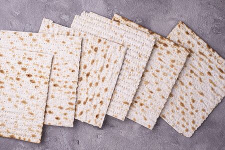 Stack of traditional matzos on gray table, above view