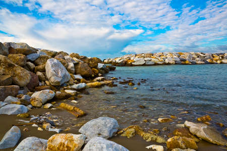 Stone breakwater on adriatic sea in Termoli, Italy with beautiful wide beach and city in the background