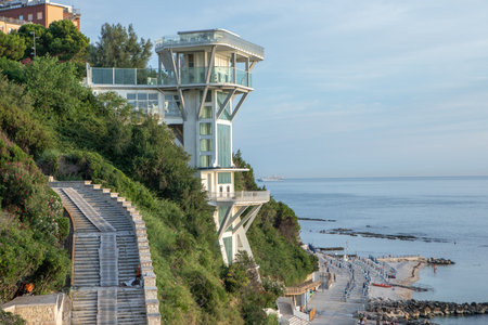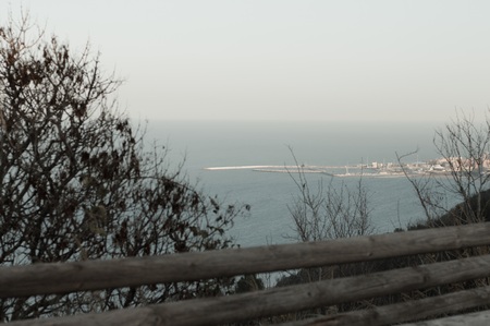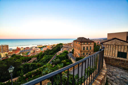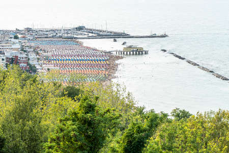 View of the beach in Numana, Italy. The resort is located on the Adriatic coast in the Marche region. The photo was taken from the historic center of the village, located on a cliff.