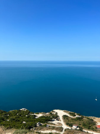 Amazing aerial view of Black Sea coast, turquoise color of the sea. Summer landscape with mountains, green forest, azure water, and blue sky in bright sunny day. Travel background. Top view.