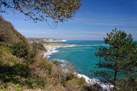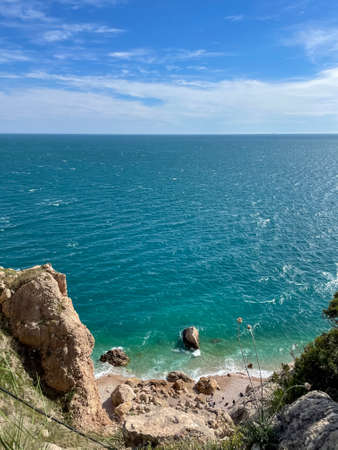 Beautiful landscape: blue sea, beach, shore with growing pine trees. The view from the top.
