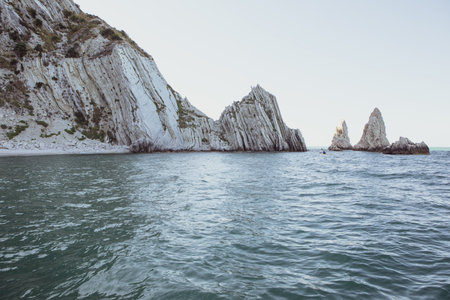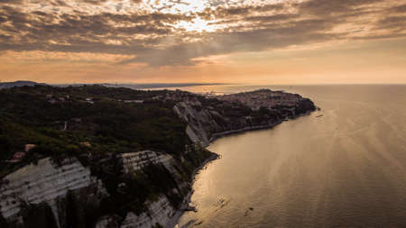 Wonderful view of Due Sorelle beach called spiaggia delle due sorelle at sunset, riviera del Conero Numana Marche Ancona adriatic sea Italy
