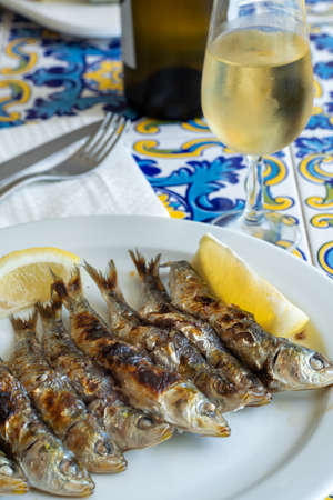 Sardines espeto, Malaga style fish on stick barbecue prepared on olive tree firewoods served with glass dry fino sherry wine