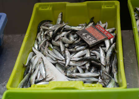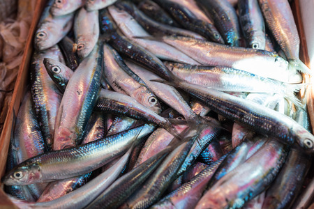 Fresh big Portuguese sardines on ice exposition at the fish market. Close up.