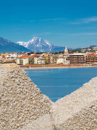View of the Pescara seafront, with the bell tower of the Divino Amore church and the Gran Sasso