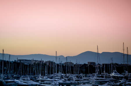 Beautiful pink and orange sunset in the sea harbor with moored yachts. Sochi, Russia.