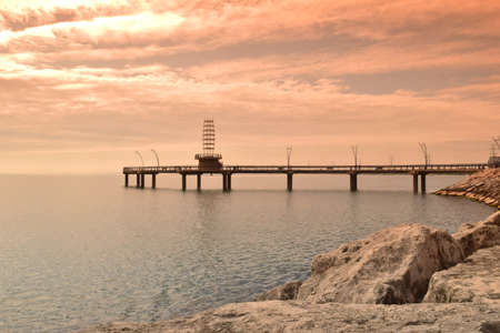 Sunrise in a mediterranean harbor (Pont del Petroli, Badalona, Barcelona, Catalonia, Spain). People are taking photos at the end of pontoon.