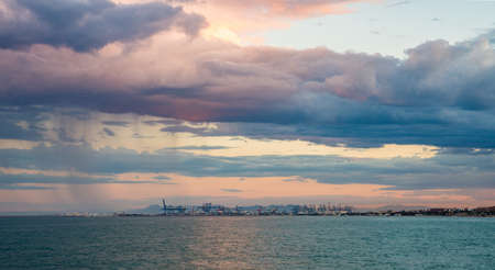 Storm with tornado in Rimini, Italy. Picturesque landscape view with sea, clouds, cityscape and whirlwind. Natural disaster. Mediterranean Sea.