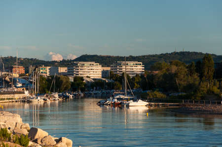Cattolica, Italy - 04-08-2021: The canal that divides Cattolica from Gabicce with the buildings that are reflected in the water at sunset