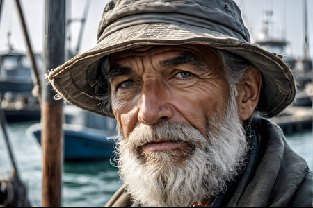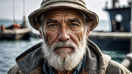 Close-up portrait of an elderly man with a white beard and weathered face, wearing a hat. Photorealistic style, harbor background. Concept of wisdom and experience