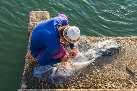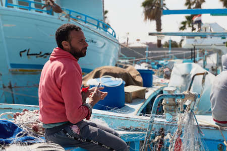 HURGHADA, EGYPT - FEBRUARY 19, 2022: Local fisherman repairs fishnets on the boat and getting their nets ready before go to sea for fishing