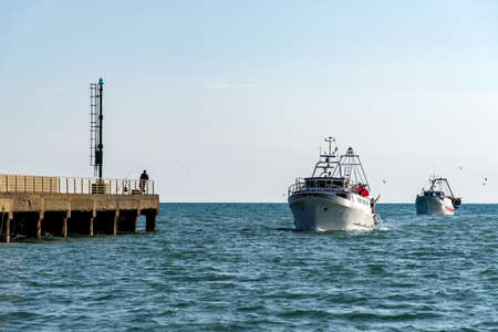 At the helm deep-sea fisherman dynamic fishing port behind