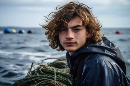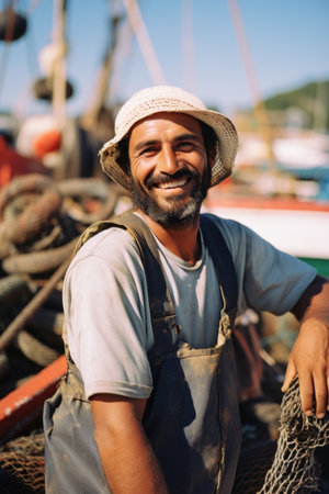 Fisherman holding a large net, standing near a boat with fishing equipment generative ai