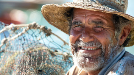 A serene portrait of a fisherman seated by the shoreline, wearing a straw hat and surrounded by fishing nets, perfectly capturing a peaceful coastal lifestyle.