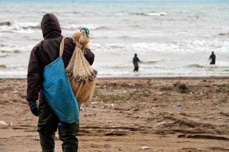fisherman with a fishing net on the seashore.