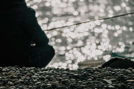 Fisherman on the shore of a calm sea. Evening fishing. Minimalistic seascape. Motion blur effect.
