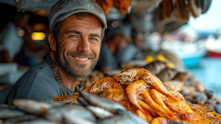 Portrait of a smiling caucasian man selling fresh seafood at a fish market.