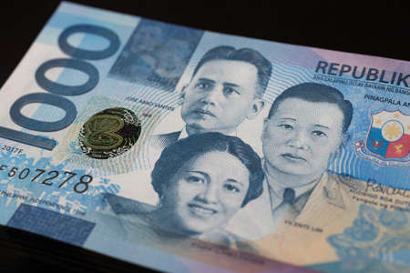 Close up of cash banknote of one thousand Philippines peso on black background, macro
