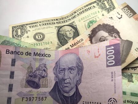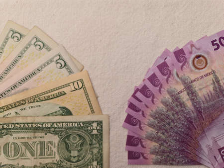 stacked mexican banknotes of fifty pesos and american dolls bills