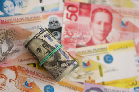Philippines peso currency money bills and bunch of us dollar banknotes close up. The concept of economics and currency exchange