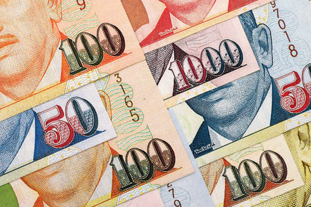 Singapore Dollar currency money bills. SGD currency banknotes in bunch with different denomination close up