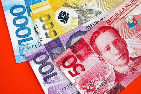 Philippines peso money bills in big amount close up on red. Finance and banking concept