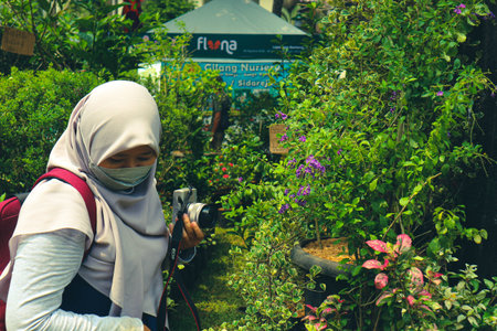 Jakarta, Indonesia in August 2022. Visitors who are lovers of flora and fauna visiting the Flona 2022 exhibition at the Banteng Field . Many families, lots of plant and food traders as well