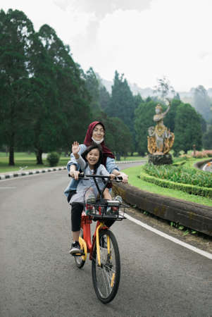 Hijab woman vacation wearing a pink dress and hijab at Kalikuning, Yogyakarta