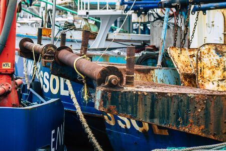Laredo, Cantabria, Spain; 08-17-2021: Red fishing boat docked next to the Marina El Laredo building and the nets packed on the asphalt ready to be picked up and loaded onto the ship