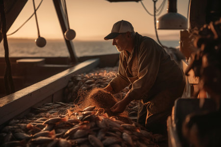 Hands of a fisherman handling a net at sunset on a fishing boat, with the golden light reflecting off the water