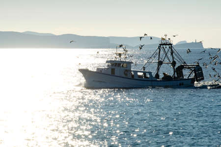 A fishing boat in the morning light, surrounded by birds, showcasing the beauty of nature and the fishing industry.