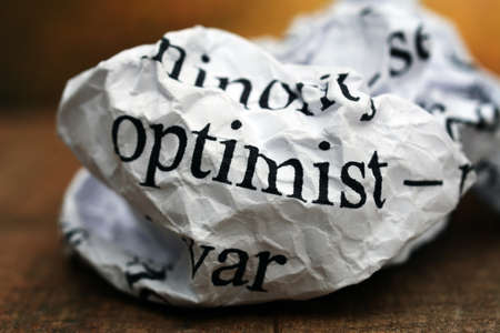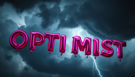 Bunch of red balloons spell out the word optimist in the sky. Concept of hope and positivity, as the balloons are floating high above the stormy sky. The contrast between the bright red balloons