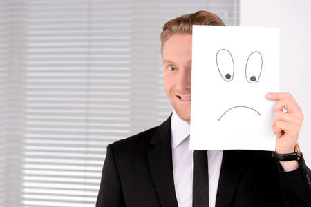 Having fun at work. Cheerful young businessman holding a poster in front of his face