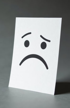 White card displaying a simple, hand-drawn sad face stands vertically against a neutral gray backdrop, conveying feelings of unhappiness, disappointment, or negativity