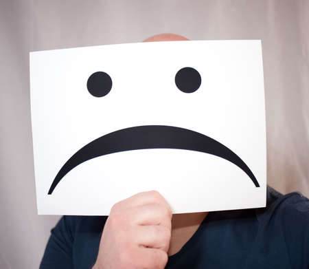 Depressive emotions concept, smiley face emoticon printed depression and sad pessimistic face sadness