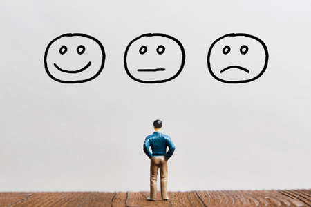 Close up customer hand choose smiley face and blurred sad face icon on wood cube, Service rating, satisfaction concept.