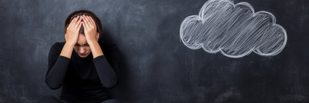 Young woman holding her head in her hands, suffering from negative thinking and mental health issues, with a thought bubble drawn on a blackboard in the background