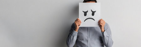 A person's hand gently holds a small piece of paper with a simple drawing of a sad face. The background is dark and blurry.