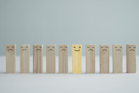 Happy smiling face among unhappy faces on wooden blocks. Positive thinking, Unique, Individuality, Difference, Emotion, Positive thinking, Mental health assessment, World mental health day concept.