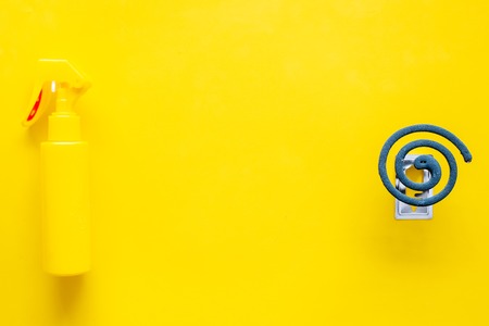 Mosquito protectors. Individual and for open space. Green spiral and spray on yellow background top view.
