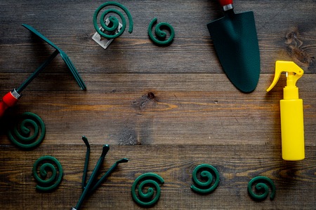 Mosquito protection for garden. Mosquito coil and spray near garden tools on dark wooden background top view copy space